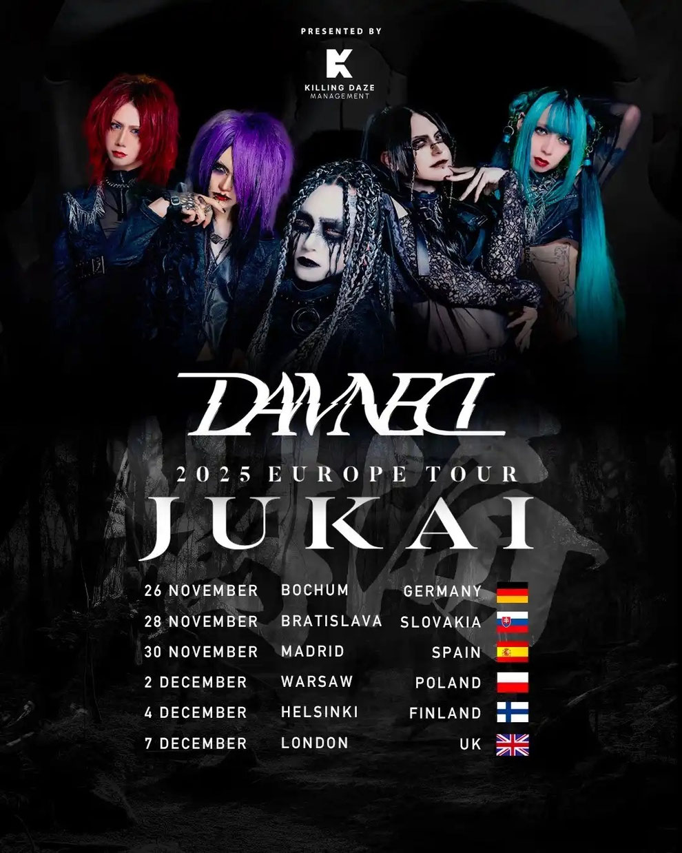 Die 2022 gegründete und aus Tokyo stammende Visual-Kei-Band DAMNED bietet intensiven Metalcore mit toller Optik und als absolutes Highlight könnt ihr die Jungs schon am 26.11.25, also in weniger als einer Woche, LIVE in der ZECHE BOCHUM sehen! DAMNED startet gleich richtig durch mit einer Europa-Tour, 6 Länder, je eine Location. Wenn ihr also richtig Bock auf tolle Musik habt, dann lasst euch diese Möglichkeit nicht entgehen Hitone, Kou., Suica, Sakura und Masaya live und in Farbe zu sehen ;)